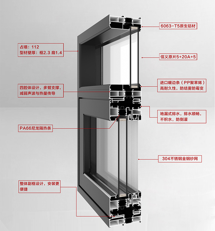 6063-T5原生鋁材 占墻:112mm 框:2.3mm 扇:1.4mm